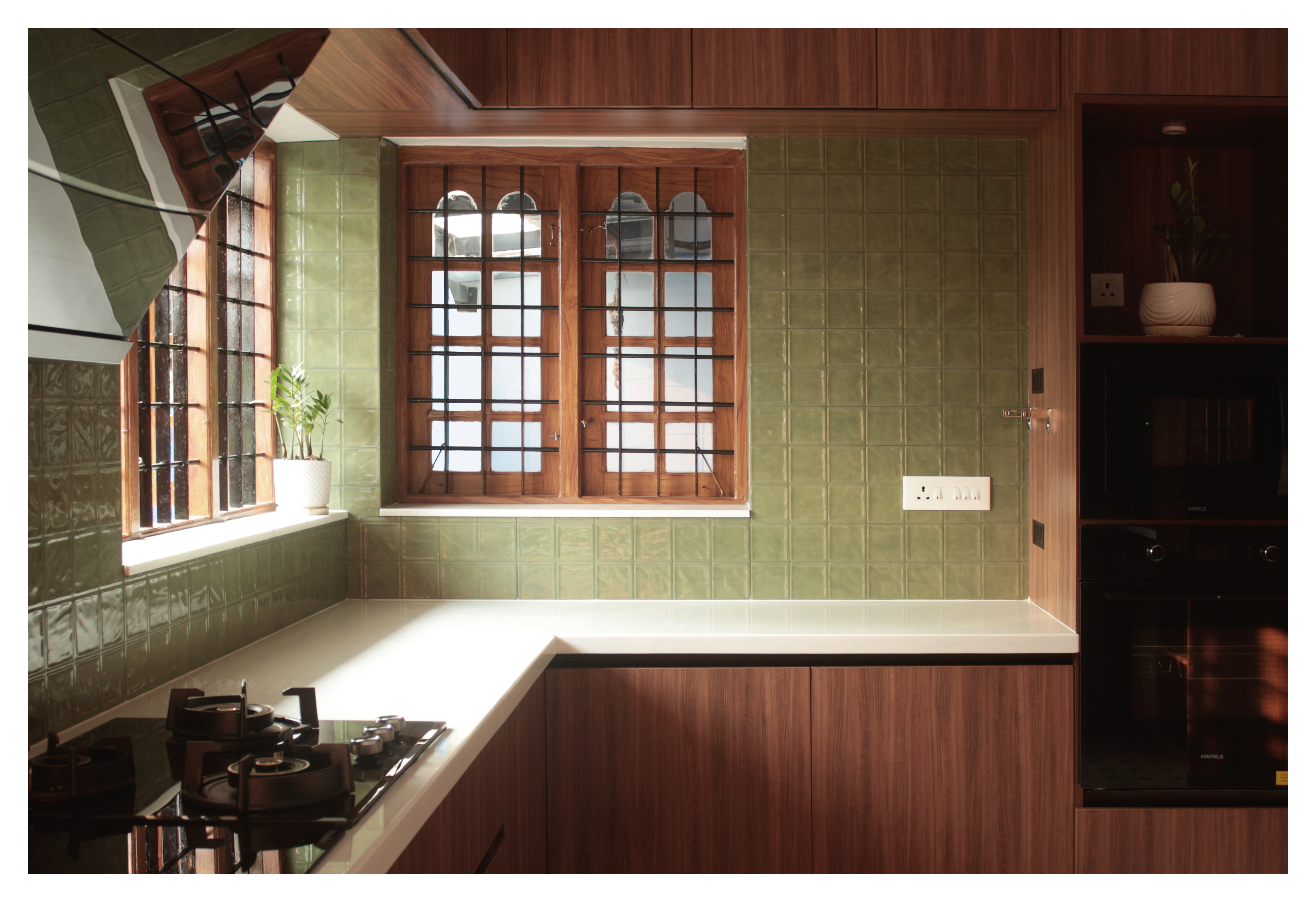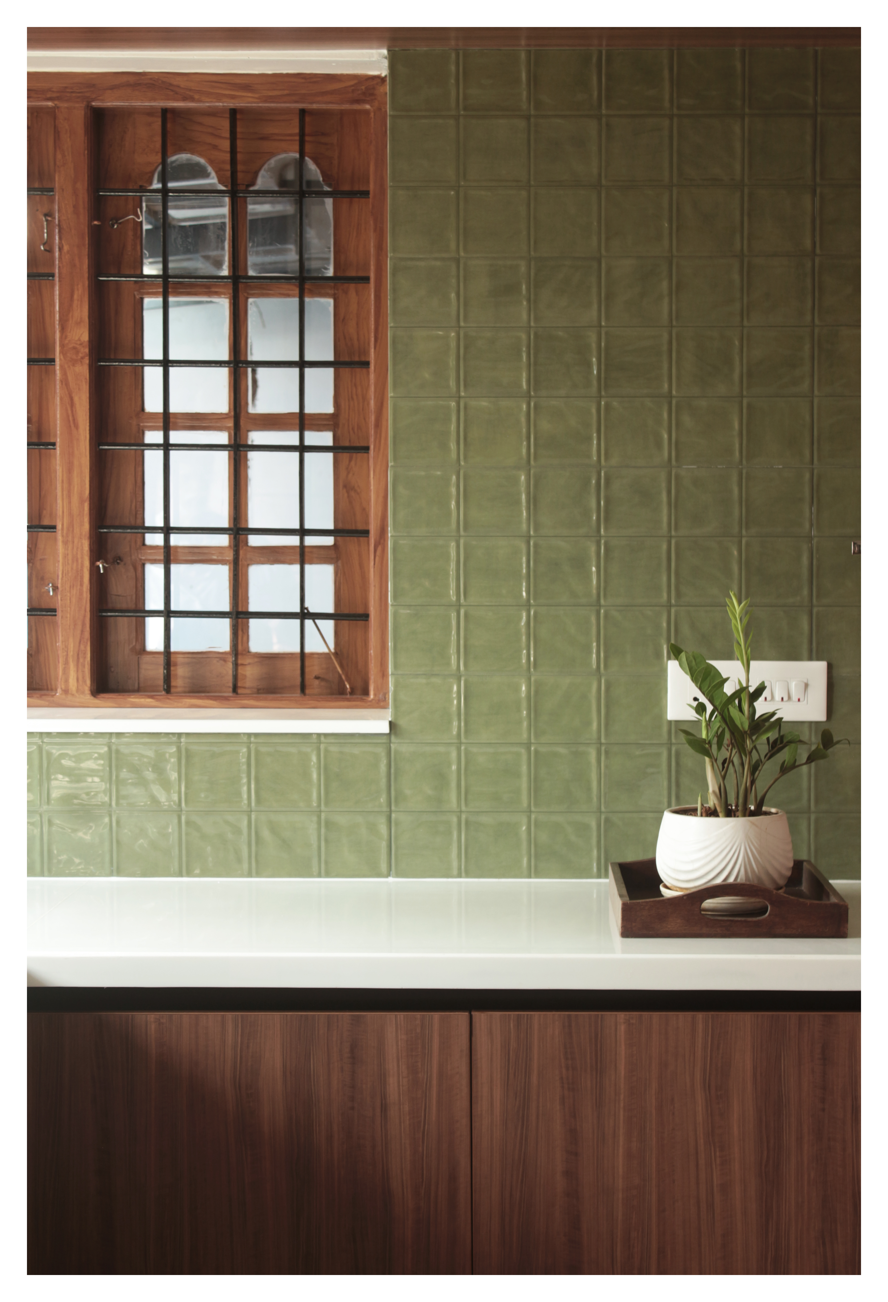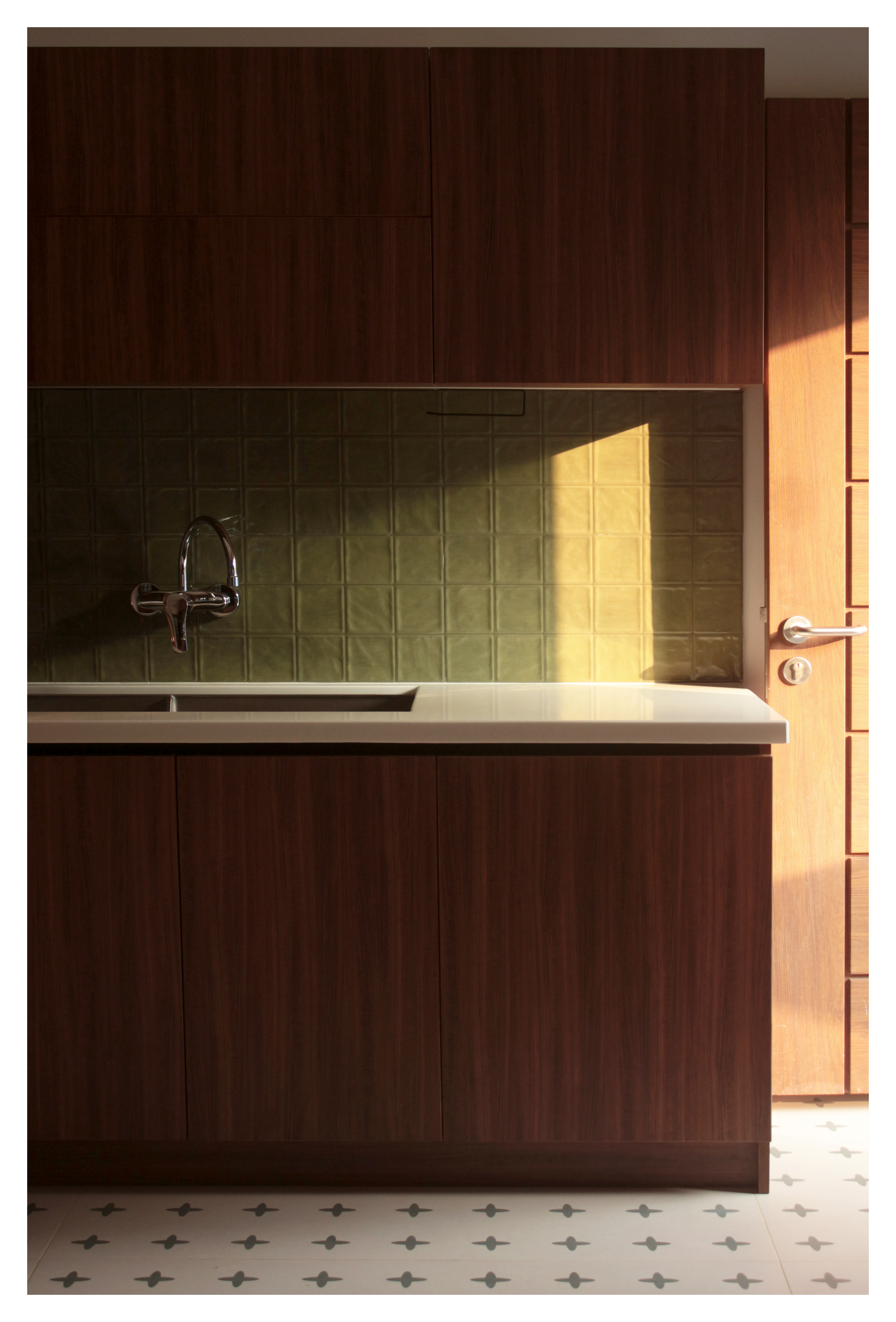 The material palette was chosen to feel as though it had always belonged here. olive-green tiles line the walls, their uneven glaze catching the light in the way only crafted, imperfect things can. Ivory floor tiles patterned with a quiet cross motif nod to the heritage of the older house, while warm walnut-toned woodwork ties the space together.