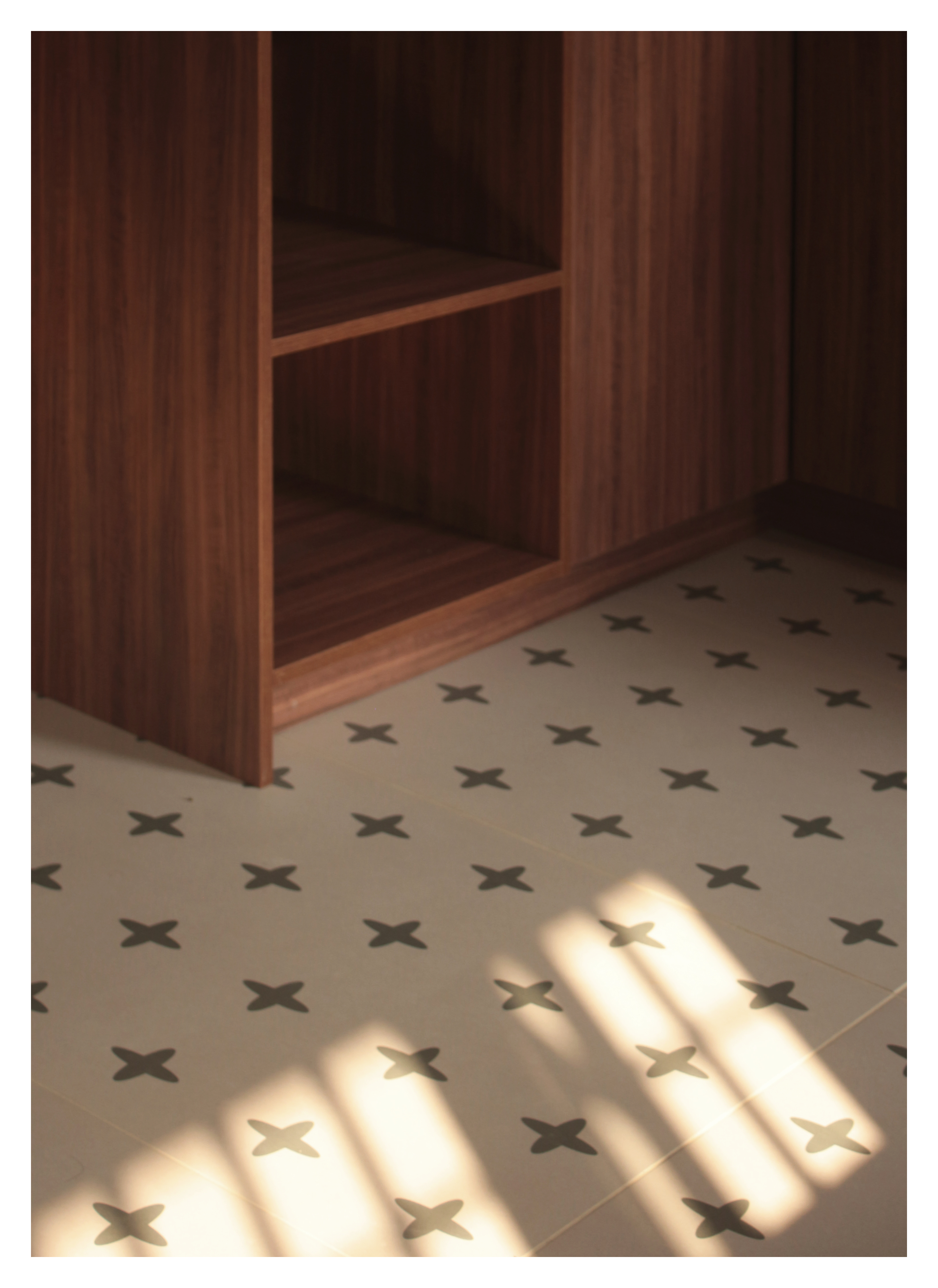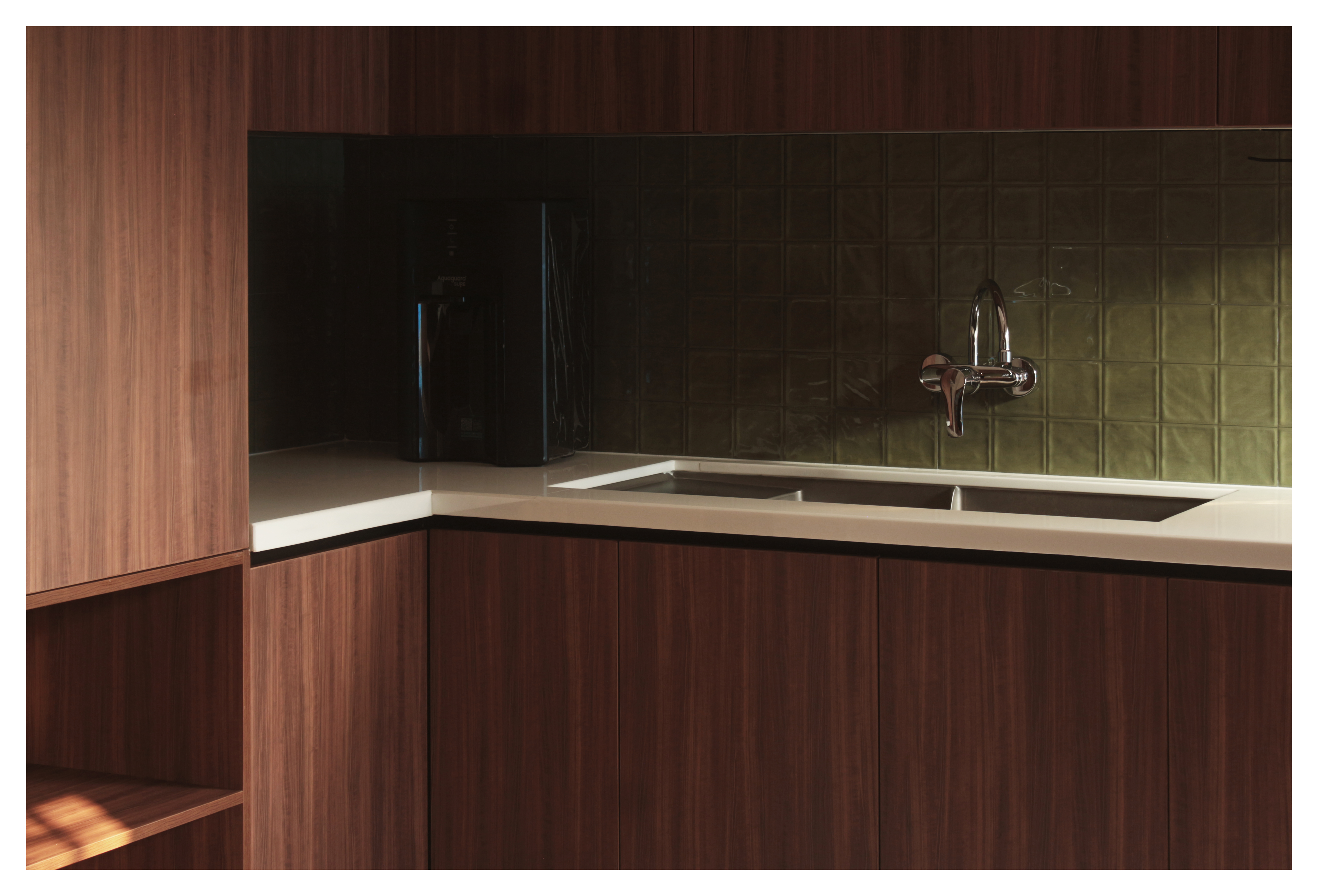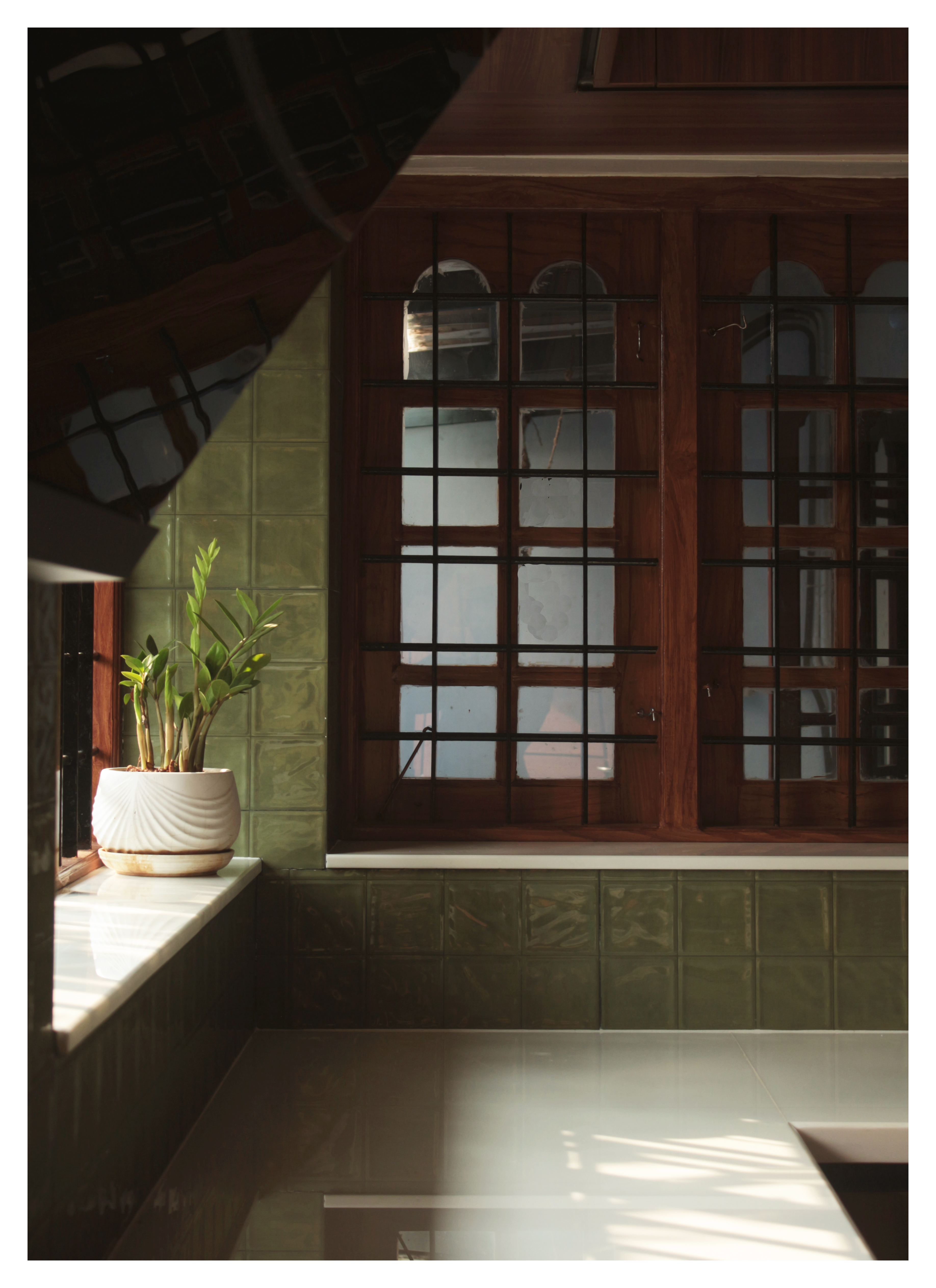 The material palette was chosen to feel as though it had always belonged here. olive-green tiles line the walls, their uneven glaze catching the light in the way only crafted, imperfect things can. Ivory floor tiles patterned with a quiet cross motif nod to the heritage of the older house, while warm walnut-toned woodwork ties the space together.